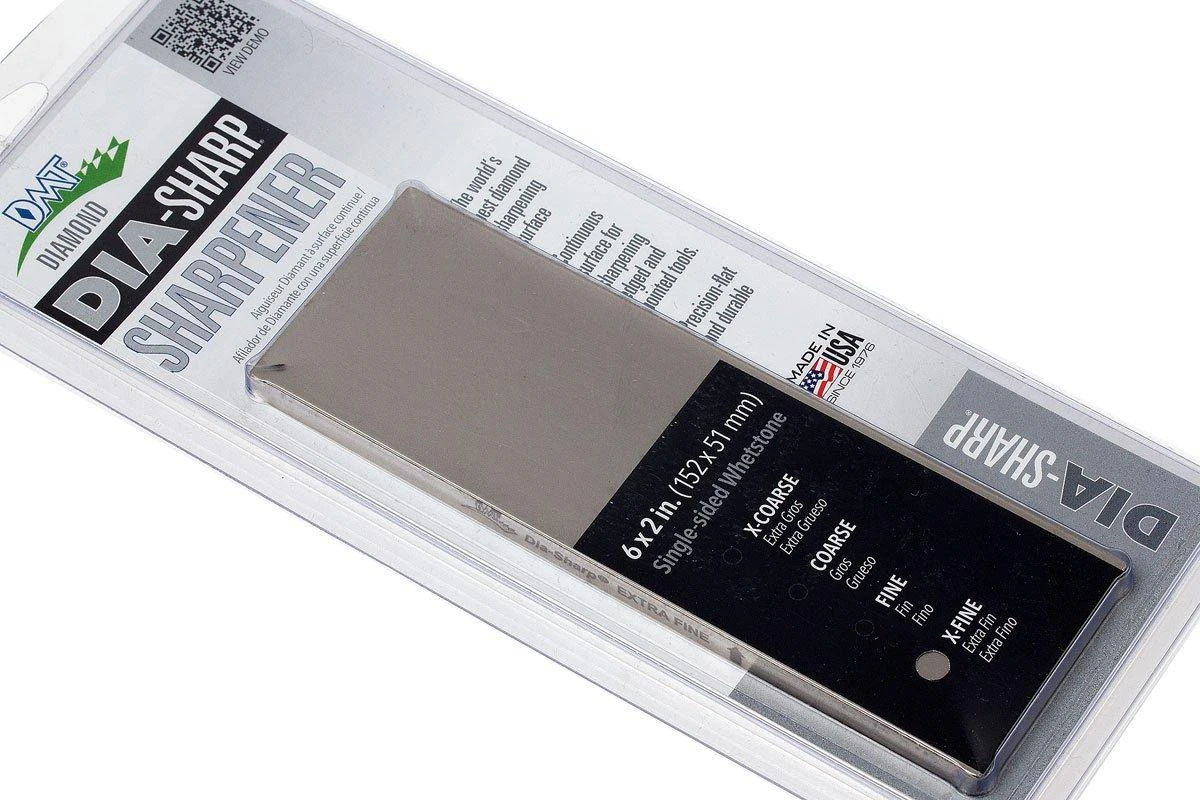 La DMT DiaSharp Bench Stone 6×2 D6E monoface, extra fin est une pierre à aiguiser compacte. La face extra fine polis la lame pour un tranchant rasoir. Les pierres à aiguiser diamant permettent un aiguisage très rapide, et extrêmement tranchant avec certaines granulométries. L’un des grands avantages des pierres à aiguiser diamant est qu’il n’est pas nécessaire de les aplanir. Sur ce modèle DiaSharp, le diamant abrasif est appliqué sur une plaque d’acier de 6 mm d’épaisseur. Cela garantit une pierre à aiguiser parfaitement plate.