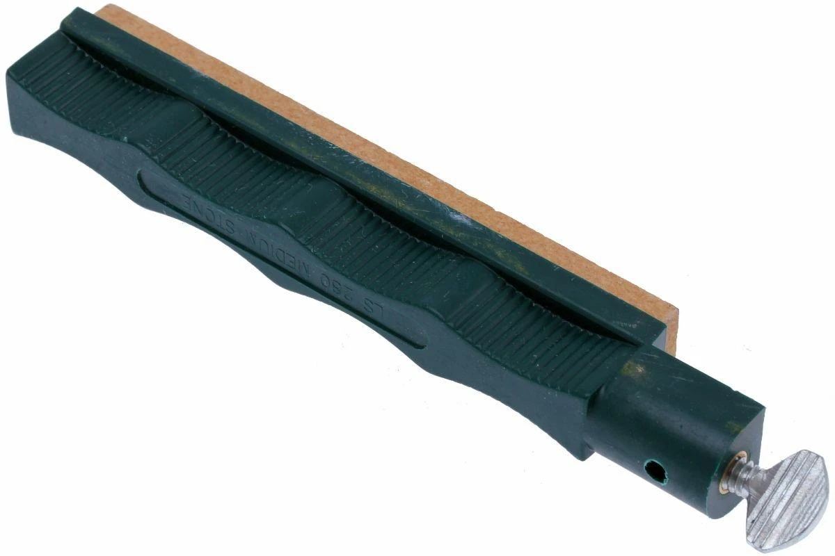 Pierre d’aiguisage pour utilisation en combinaison avec un système d’aiguisage Lansky. Cette pierre d’aiguisage possède une granulation moyenne et est pensée comme pas intermédiaire dans le procédé d’aiguisage. Après avoir réparé une lame avec une granulation grossière, on aiguise avec cette pierre. Pour un résultat optimum il faudra ensuite aiguiser avec granulation fine.